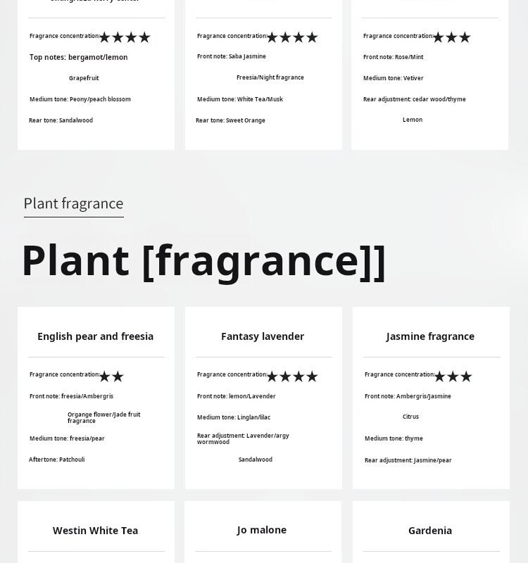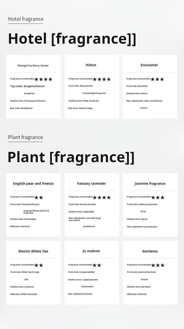 | Flavor | Blue Phoenix Bell, Freesia, Gardenia, Hilton, Jasmine, lavender, Met, Shangri-La, Westin White Tea |